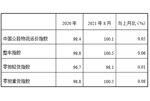 2021年8月份中國公路物流運價指數(shù)為100.1點