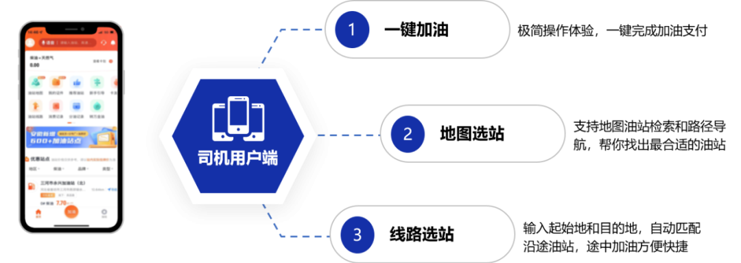 司機用戶可使用手機APP,輕松完成線路規(guī)劃、油站檢索、路徑導(dǎo)航和一鍵加油等一系列智能化的加油操作。